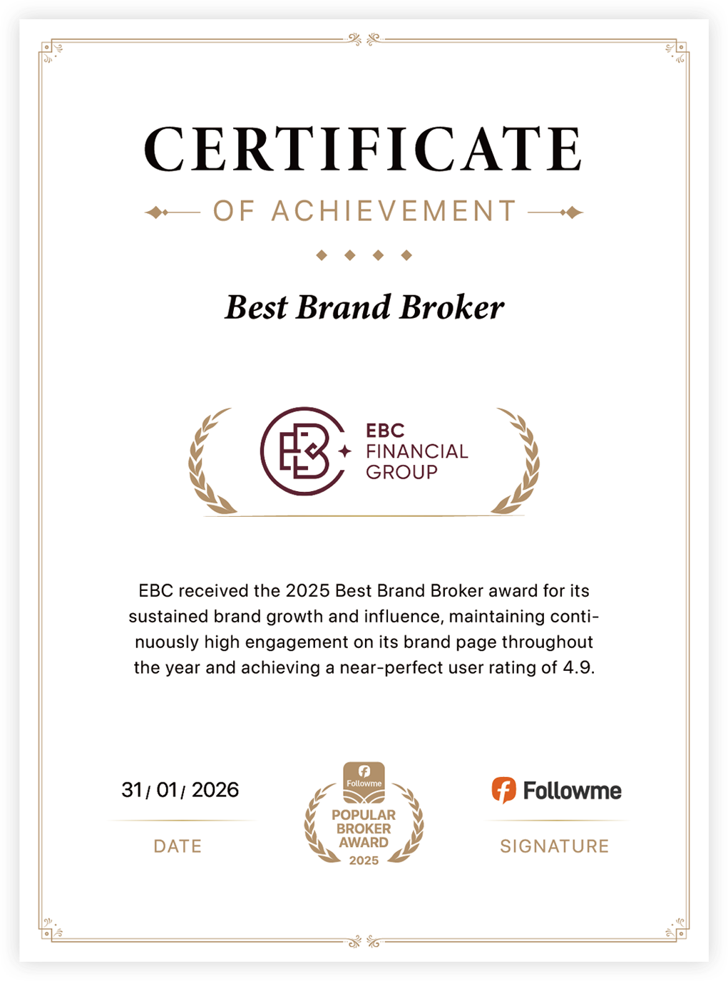 这已是EBC连续第三年获得Followme颁发的年度荣誉。从“十大最受欢迎券商”,到“全球最受好评券商”,再到今天的“年度全球最佳品牌券商”——每一项奖项的背后都体现了EBC对“以客户为中心”理念的长期坚持,同时也见证了其在全球交易者心中的深远影响力。
